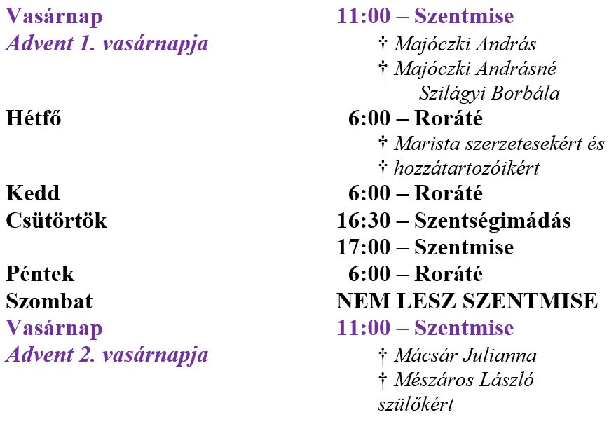 A miserend az alábbiak szerint alakul a november 30. – december 7. közötti időszakban a karcagi Szent István király-templomban.