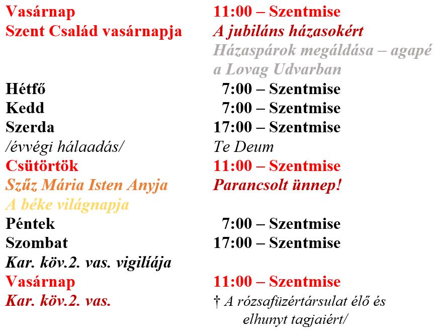 A miserend az alábbiak szerint alakul a december 28. – január 4. közötti időszakban a karcagi Szent István király-templomban.