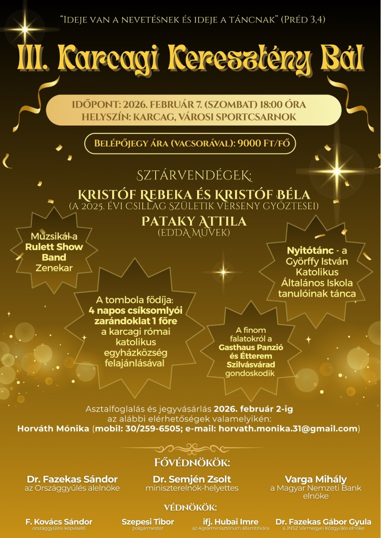 A Karcagi Római Katolikus Plébánia idén is megszervezi a már hagyományosnak tekinthető nagyszabású bálját. A III. Karcagi Keresztény Bálra 2026. február 7-én 18:00 órai kezdettel kerül sor, melyre sok szeretettel várunk mindenkit – felekezeti hovatartozástól függetlenül -, aki egy igazán felhőtlen szórakozásra vágyik.