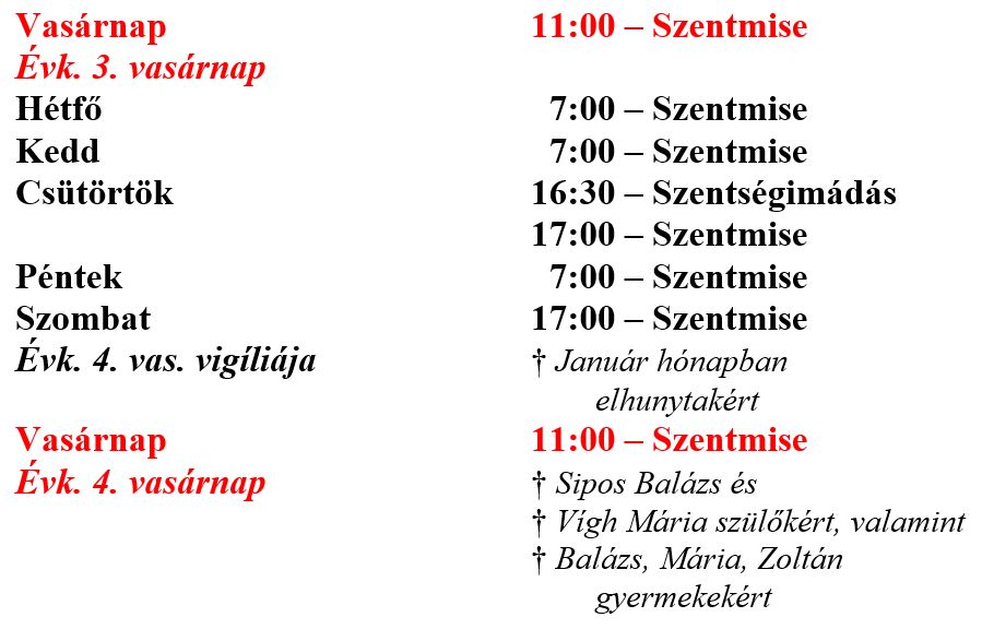 A miserend az alábbiak szerint alakul a január 25. – február 1. közötti időszakban a karcagi Szent István király-templomban.