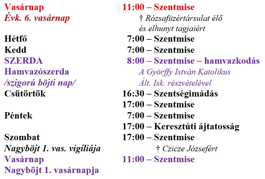 A miserend az alábbiak szerint alakul a február 15. – február 22. közötti időszakban a karcagi Szent István király-templomban.