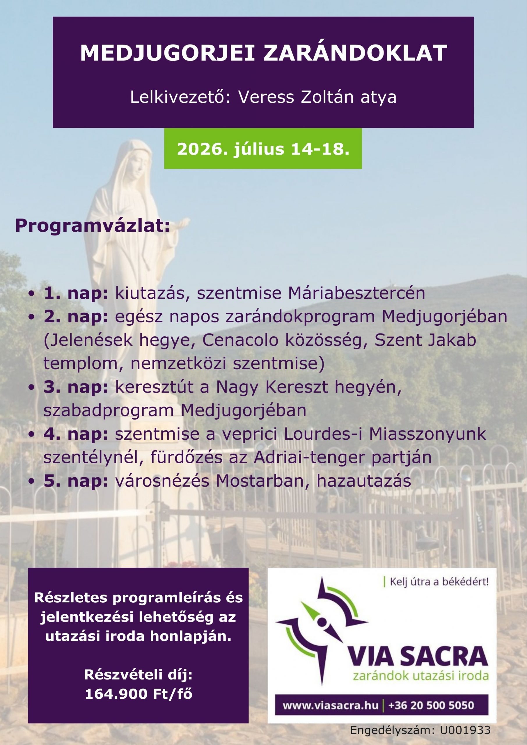 A zarándoklat időpontja 2026. július 14-18., lelkivezetője Veress Zoltán, karcagi plébános.