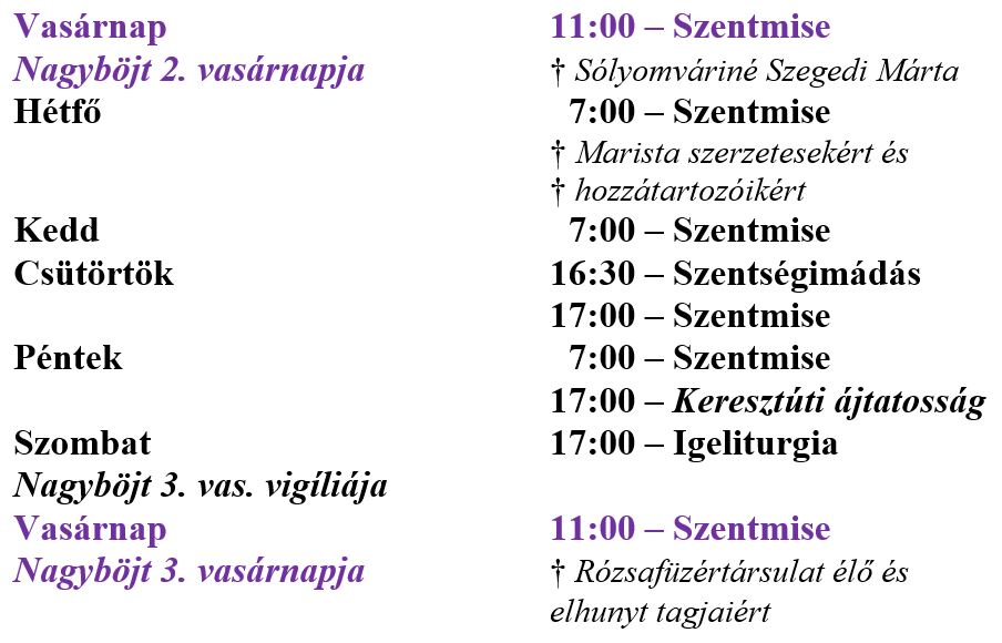 A miserend az alábbiak szerint alakul a március 1. – március 8. közötti időszakban a karcagi Szent István király-templomban.