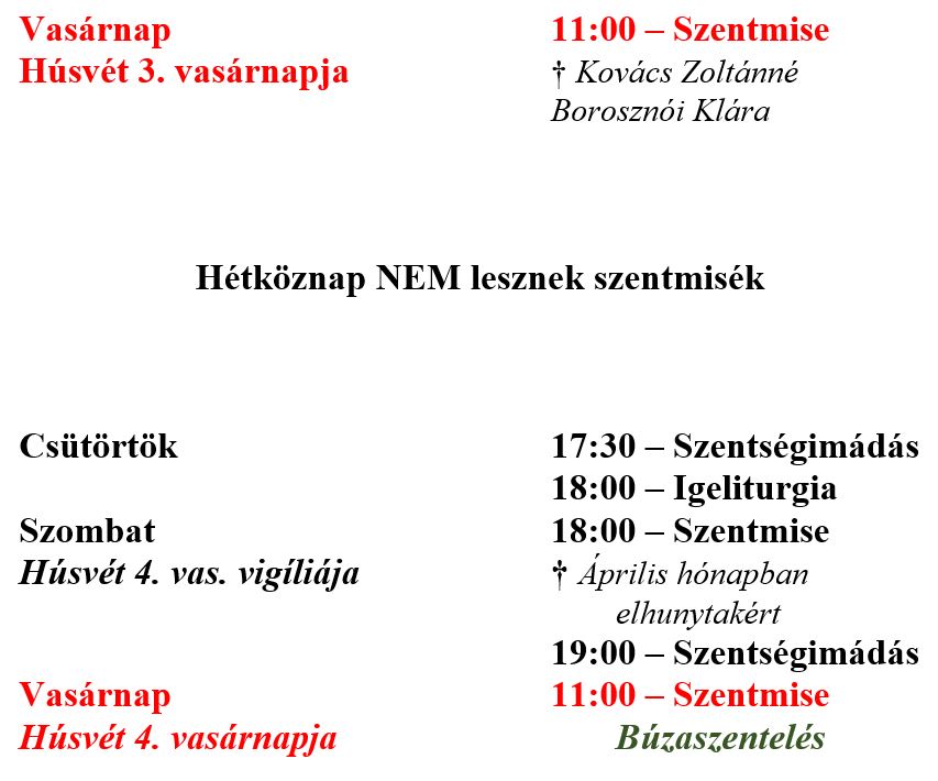 Szentmisék rendje Berekfürdőn: – március 29-én (vasárnap) 10:00 órakor – április 2-án (csütörtök) 18:00 órakor – április 3-án (péntek) 18:00 órakor – április 4-én (szombat) 18:00 órakor – április 5-én (vasárnap) 10:00 órakor – április 6-án (hétfő) 8:00 órakor
