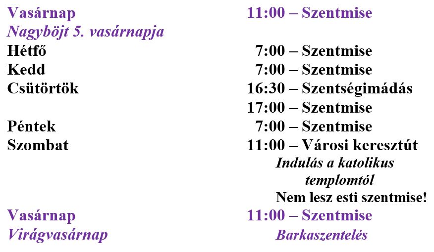 A miserend az alábbiak szerint alakul a március 22. – március 29. közötti időszakban a karcagi Szent István király-templomban.