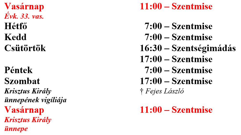 A miserend az alábbiak szerint alakul a november 16. – november 23. közötti időszakban a karcagi Szent István király-templomban.